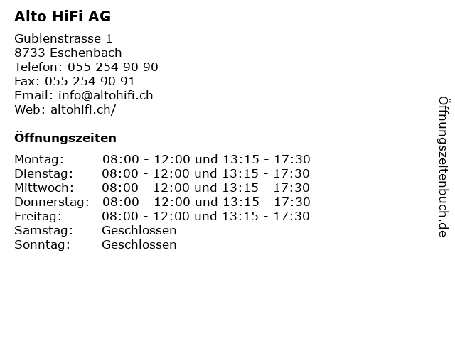 | Öffnungszeiten Alto HiFi AG in Eschenbach anzeigen | |