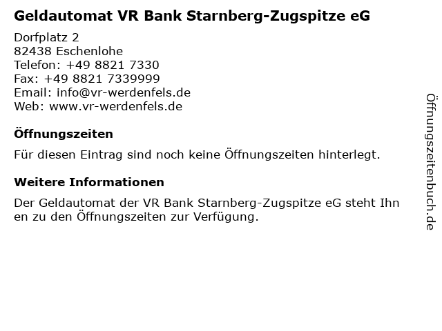 | Geldautomat VR Bank Starnberg-Zugspitze eG anrufen | |