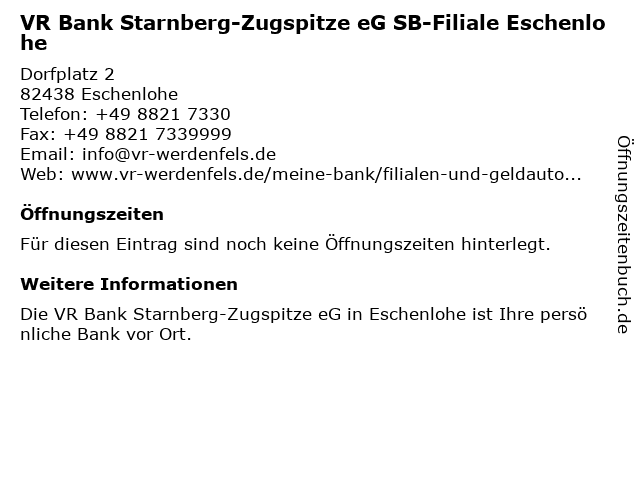 | VR Bank Starnberg-Zugspitze eG SB-Filiale Eschenlohe anrufen | |
