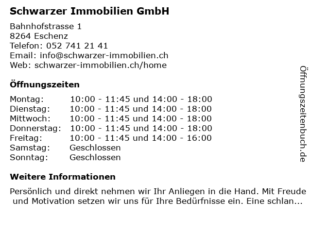 | Öffnungszeiten Schwarzer Immobilien GmbH in Eschenz anzeigen | |