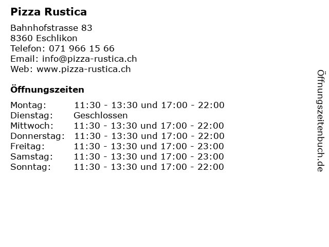 | Öffnungszeiten Pizza Rustica in Eschlikon anzeigen | |