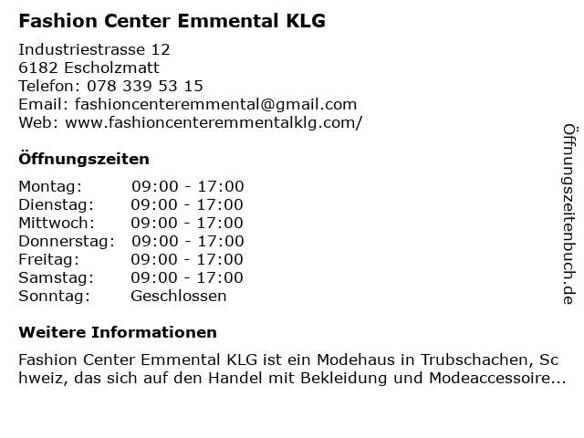 Branchen & Suchbegriffe zu Fashion Center Emmental KLG:center, emmental, fashion, geschäft für damenmode, geschäft für modeaccessoires, klg, textilfabrik |