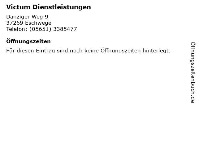 | Öffnungszeiten Victum Dienstleistungen in Eschwege anzeigen | |