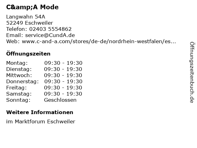 | Öffnungszeiten C&A Mode in Eschweiler anzeigen | |