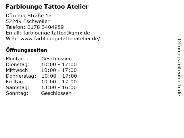 | Öffnungszeiten Farblounge Tattoo Atelier in Eschweiler anzeigen | |