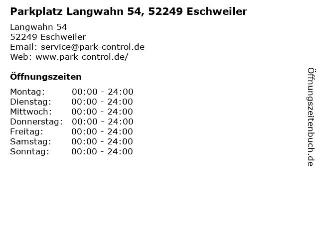 | Öffnungszeiten Parkplatz Langwahn 54, 52249 Eschweiler in Eschweiler anzeigen | |