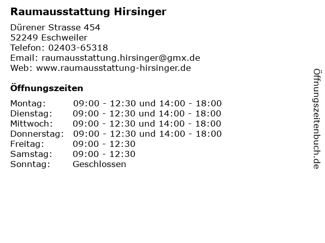 | Öffnungszeiten Raumausstattung Hirsinger in Eschweiler anzeigen | |