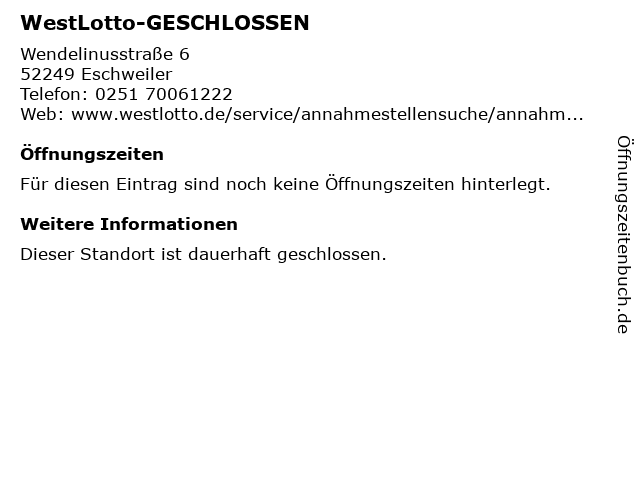 | Adresse WestLotto-GESCHLOSSEN in Eschweiler anzeigen |