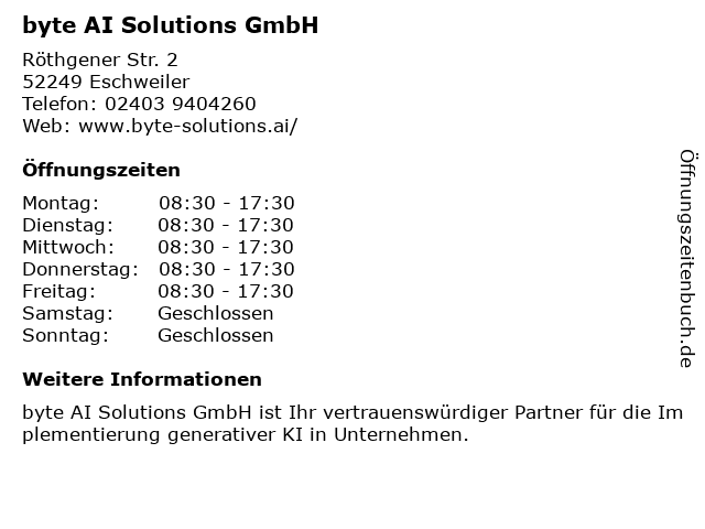 | Öffnungszeiten byte AI Solutions GmbH in Eschweiler anzeigen | |