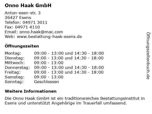| Öffnungszeiten Onno Haak GmbH in Esens anzeigen | |