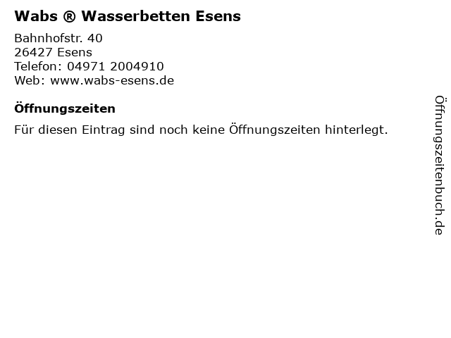 | Öffnungszeiten Wabs ® Wasserbetten Esens in Esens anzeigen | |