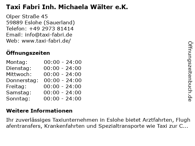 Branchen & Suchbegriffe zu Taxi Fabri Inh. Michaela Wälter e.K.:arztfahrt, e.k., fabri, flughafentransfer, krankenfahrten, kurierdienst, michaela, mietwagen, rollstuhlfahrten, taxi, taxi strahlentherapie, taxi zur chemotherapie, taxi zur dialyse, taxiunternehmen, taxiunternehmen eslohe, wälter |