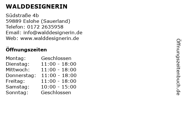 | Öffnungszeiten WALDDESIGNERIN in Eslohe (Sauerland) anzeigen | |