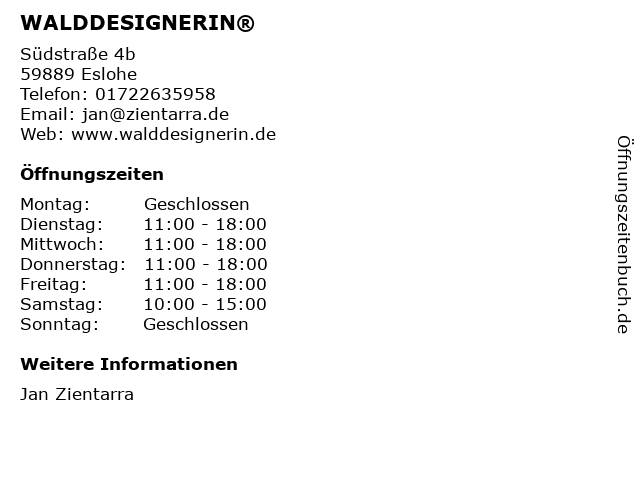 | Öffnungszeiten WALDDESIGNERIN® in Eslohe anzeigen | |