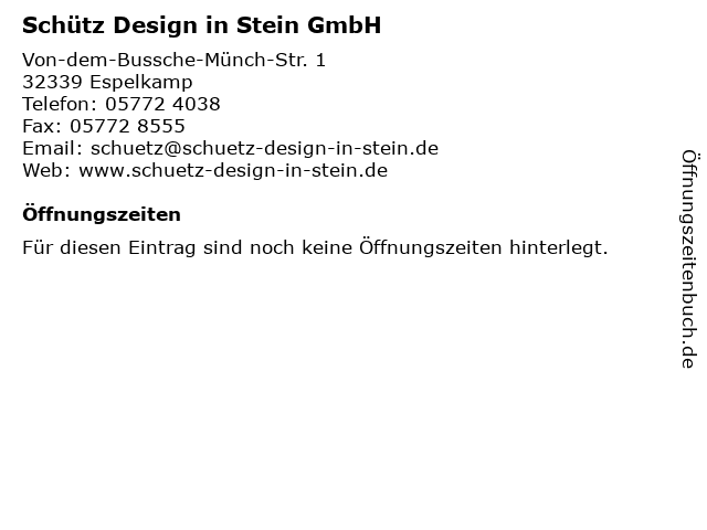 | Öffnungszeiten Schütz Design in Stein GmbH in Espelkamp anzeigen | |