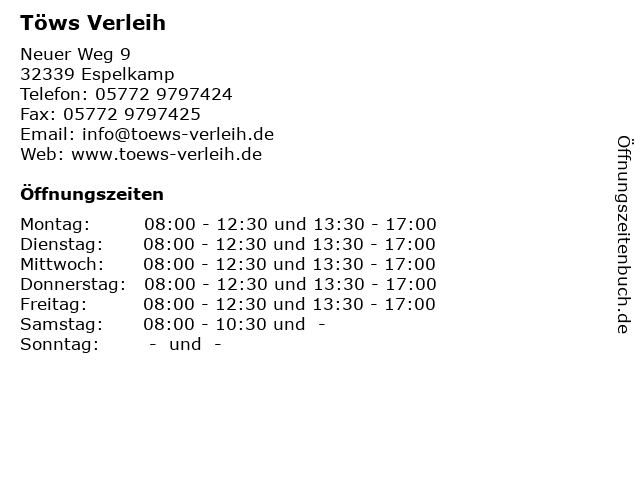| Öffnungszeiten Töws Verleih in Espelkamp anzeigen | |