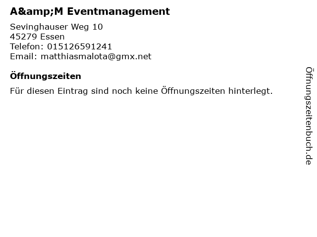 | Öffnungszeiten A&M Eventmanagement in Essen anzeigen | |