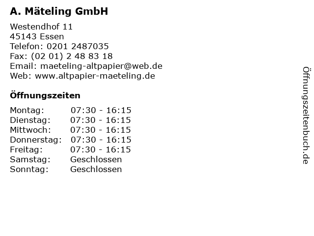 | Öffnungszeiten A. Mäteling GmbH in Essen anzeigen | |
