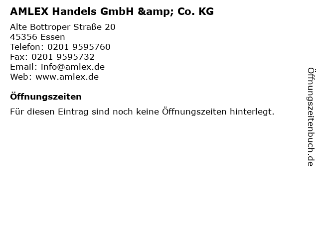| Öffnungszeiten AMLEX Handels GmbH & Co. KG in Essen anzeigen | |