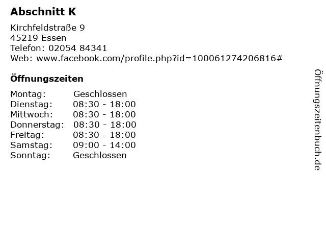 | Öffnungszeiten Abschnitt K in Essen anzeigen | |