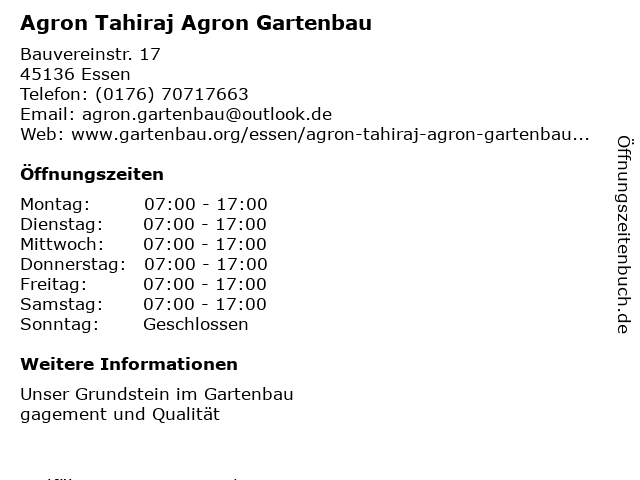| Öffnungszeiten Agron Tahiraj Agron Gartenbau in Essen anzeigen | |