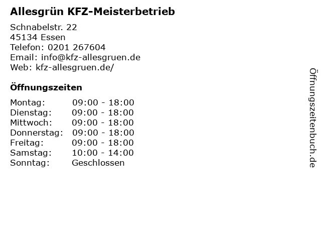 | Öffnungszeiten Allesgrün KFZ-Meisterbetrieb in Essen anzeigen | |