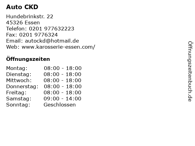 | Öffnungszeiten Auto CKD in Essen anzeigen | |