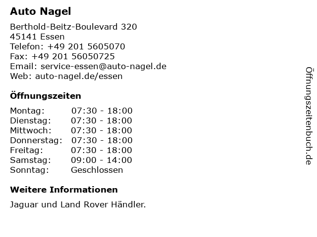 | Öffnungszeiten Auto Nagel in Essen anzeigen | |