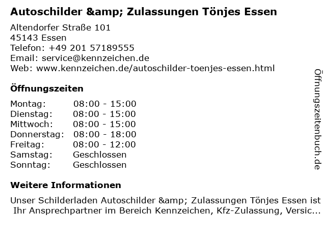 4 Autoschilder & Zulassungen Bavaria Gelsenkirchen (Entfernung: 9,25 km) Wildenbruchstraße 10, 45879 Gelsenkirchen 5 Autoschilder & Zulassungen Tönjes Gelsenkirchen (Entfernung: 9,27 km) Wildenbruchstraße 11, 45888 Gelsenkirchen 6 |