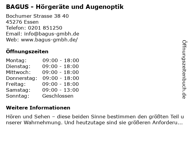 2 Bagus GmbH & Co. KG Hörgeräte und Augenoptik (Entfernung: 0,01 km) Bochumer Straße 38-40, 45276 Essen 6 |