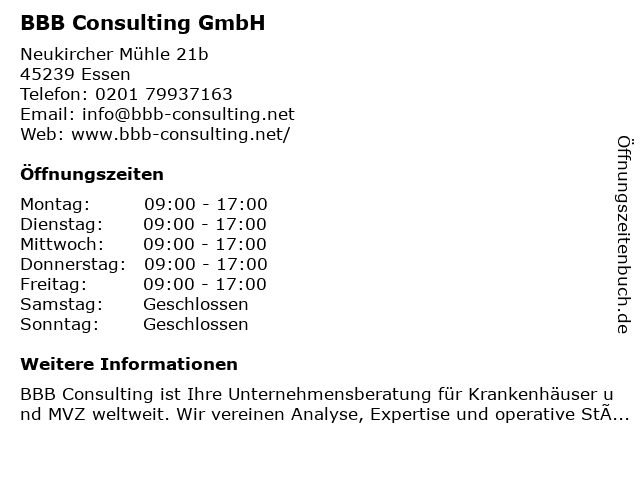 | Öffnungszeiten BBB Consulting GmbH in Essen anzeigen | |
