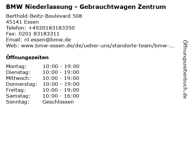 Branchen & Suchbegriffe zu BMW Niederlassung - Gebrauchtwagen Zentrum:10:00, 17:00, 20:00, auto, autohaus, beratung, besichtigung, bis, bmw, essen, gebrauchtwagen, kein, kfz, neuwagen, niederlassung, sa., so., uhr, verkauf, zentrum |