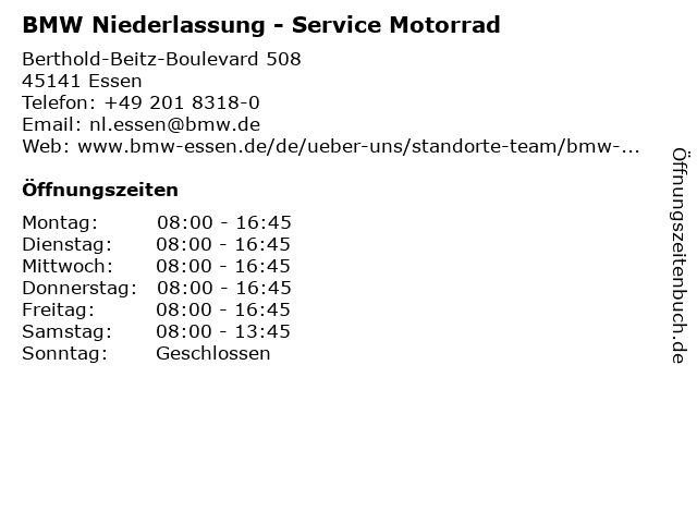 5 BMW Niederlassung - Gebrauchtwagen Zentrum (Entfernung: 0,13 km) Berthold-Beitz-Boulevard 508, 45141 Essen 6 BMW Niederlassung Essen BMW Gebrauchtwagenzentrum (Entfernung: 0,37 km) Berthold-Beitz-Boulevard 522, 45141 Essen |