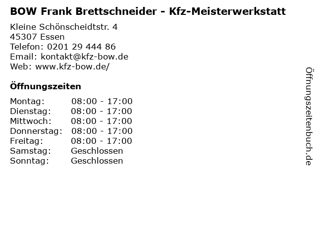 1 BOW Frank Brettschneider KFZ-Meisterbetrieb (Entfernung: 1,47 km) Kleine Schönscheidtstr. 4, 45307 Essen 4 Gelsengarage GmbH Autofit Meisterwerkstatt (Entfernung: 9,23 km) Theodor-Otte-Str. 152, 45897 Gelsenkirchen 5 MVN KFZ - Meisterwerkstatt Maik Nowotny (Entfernung: 12,87 km) Schultenhofstraße 19-23, 45475 Mülheim an der Ruhr 6 |