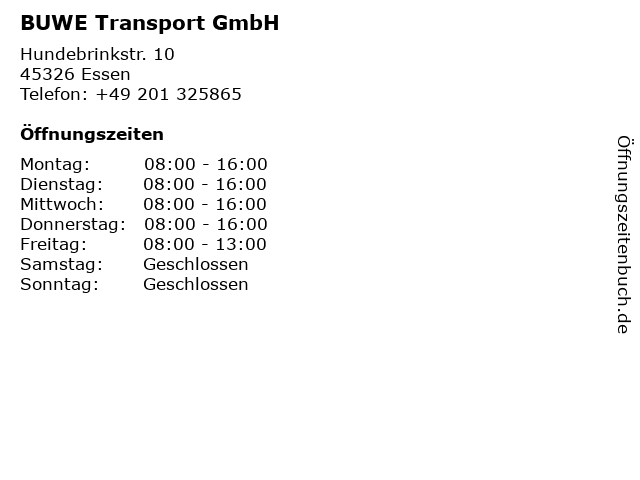 | Öffnungszeiten BUWE Transport GmbH in Essen anzeigen | |