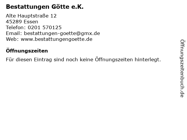 | Öffnungszeiten Bestattungen Götte e.K. in Essen anzeigen | |