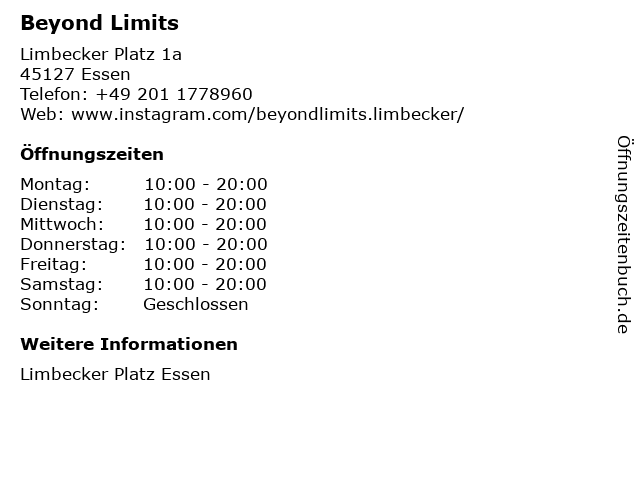 | Öffnungszeiten Beyond Limits in Essen anzeigen | |