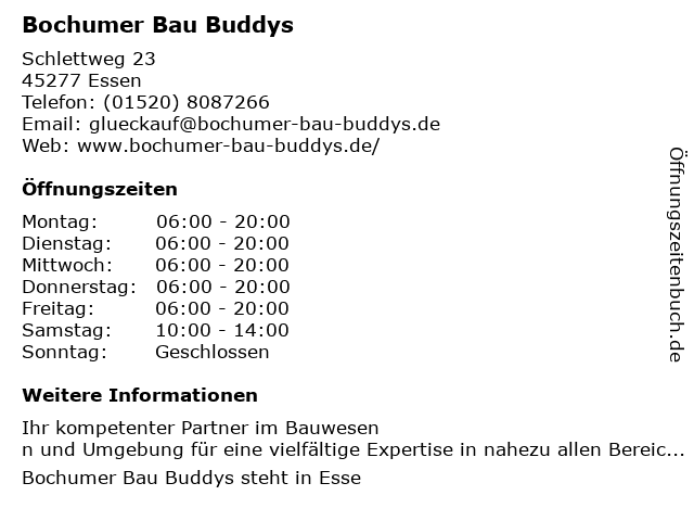 | Öffnungszeiten Bochumer Bau Buddys in Essen anzeigen | |