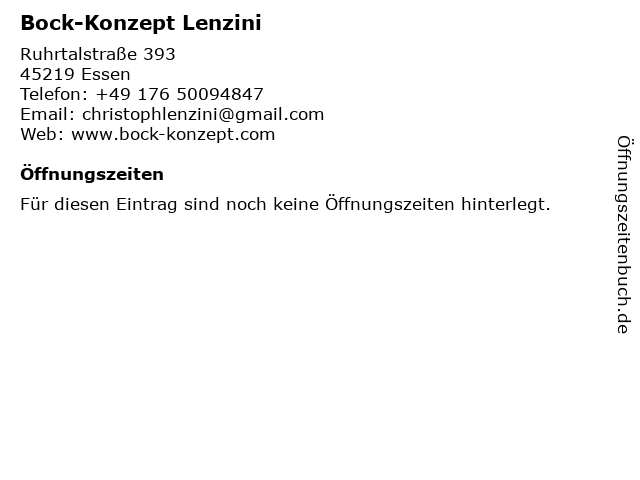 | Öffnungszeiten Bock-Konzept Lenzini in Essen anzeigen | |