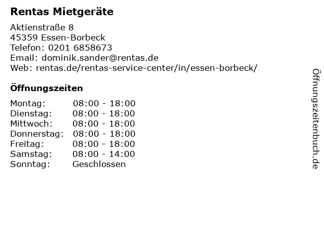 | Öffnungszeiten Rentas Mietgeräte in Essen-Borbeck anzeigen | |