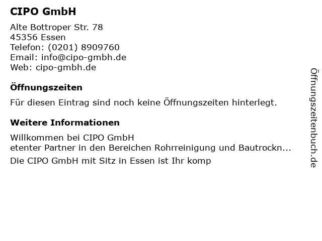 | Öffnungszeiten CIPO GmbH in Essen anzeigen | |