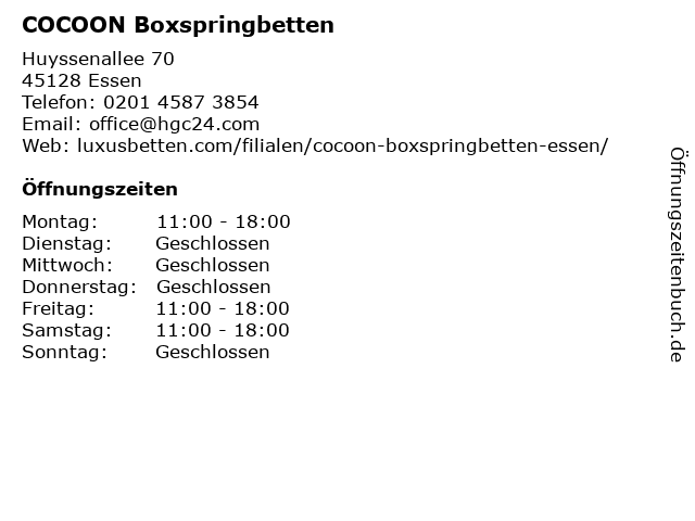 | Öffnungszeiten COCOON Boxspringbetten in Essen anzeigen | |
