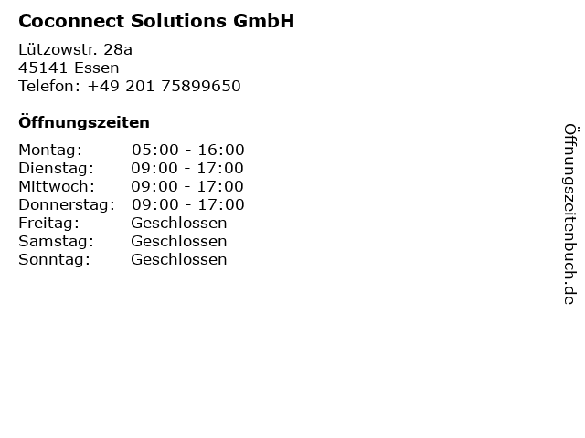 | Öffnungszeiten Coconnect Solutions GmbH in Essen anzeigen | |