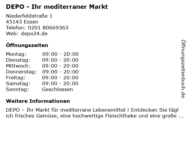 | Öffnungszeiten DEPO - Ihr mediterraner Markt in Essen anzeigen | |