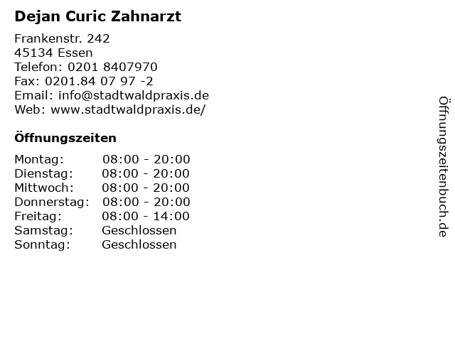 | Telefonnummer Dejan Curic Zahnarzt in Essen (0201 8407970) anrufen | |