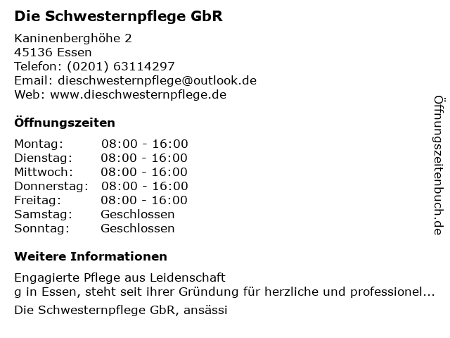 | Öffnungszeiten Die Schwesternpflege GbR in Essen anzeigen | |