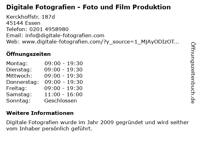 1 Digitale Fotografien - Foto und Film Produktion (Entfernung: 0,03 km) Kerckhoffstraße 187, 45144 Essen 3 InTELEgent Ges.für Mediendesign mbH Film- und Fernsehproduktion (Entfernung: 2,16 km) Kruppstr. 86, 45145 Essen 6 |