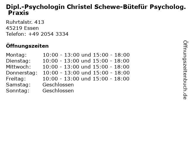 Branchen & Suchbegriffe zu Dipl.-Psychologin Christel Schewe-Bütefür Psycholog. Praxis:bütefür, christel, dipl., praxis, psycholog., psychologin, schewe |