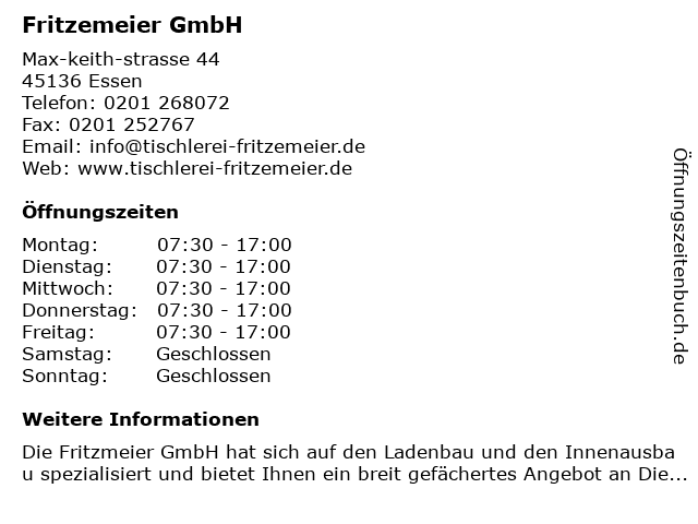 | Öffnungszeiten Fritzemeier GmbH in Essen anzeigen | |