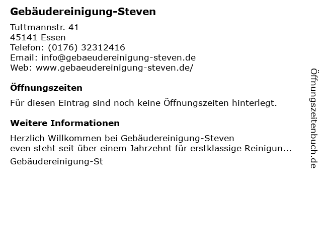 | Öffnungszeiten Gebäudereinigung-Steven in Essen anzeigen | |